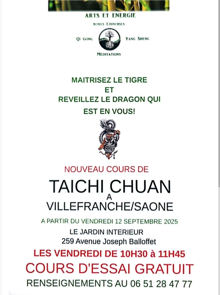 Pratiquant depuis plus de 40 ans les arts martiaux et énergétiques, passionné , je n’ai de cesse de transmettre ces richesses de la culture chinoise. Je continue de me former chez Atémi , ainsi qu’auprès de Yan He à la Grue Blanche (Zhi Neng Qi Gong), de Gérard Edde ( école de la porte du Dragon), Thierry Alibert (Ecole du Tao), Chrystel Herbeau Del Pino (Santé Autonome),Michèle et Christian Ribert ( Da Cheng Chuan et Yang Sheng, à l’institut Calam)
